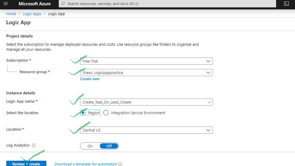 Select Subscription, Resource Group (Create new or select existing), Provide Logic App name (name should not include spaces E.g.: Create_task_On_Lead_Create), Select region (of your choice), Log Analytics Off then click on Review + Create button. Once you click Review+Create button it will validate the details and enble Create button.